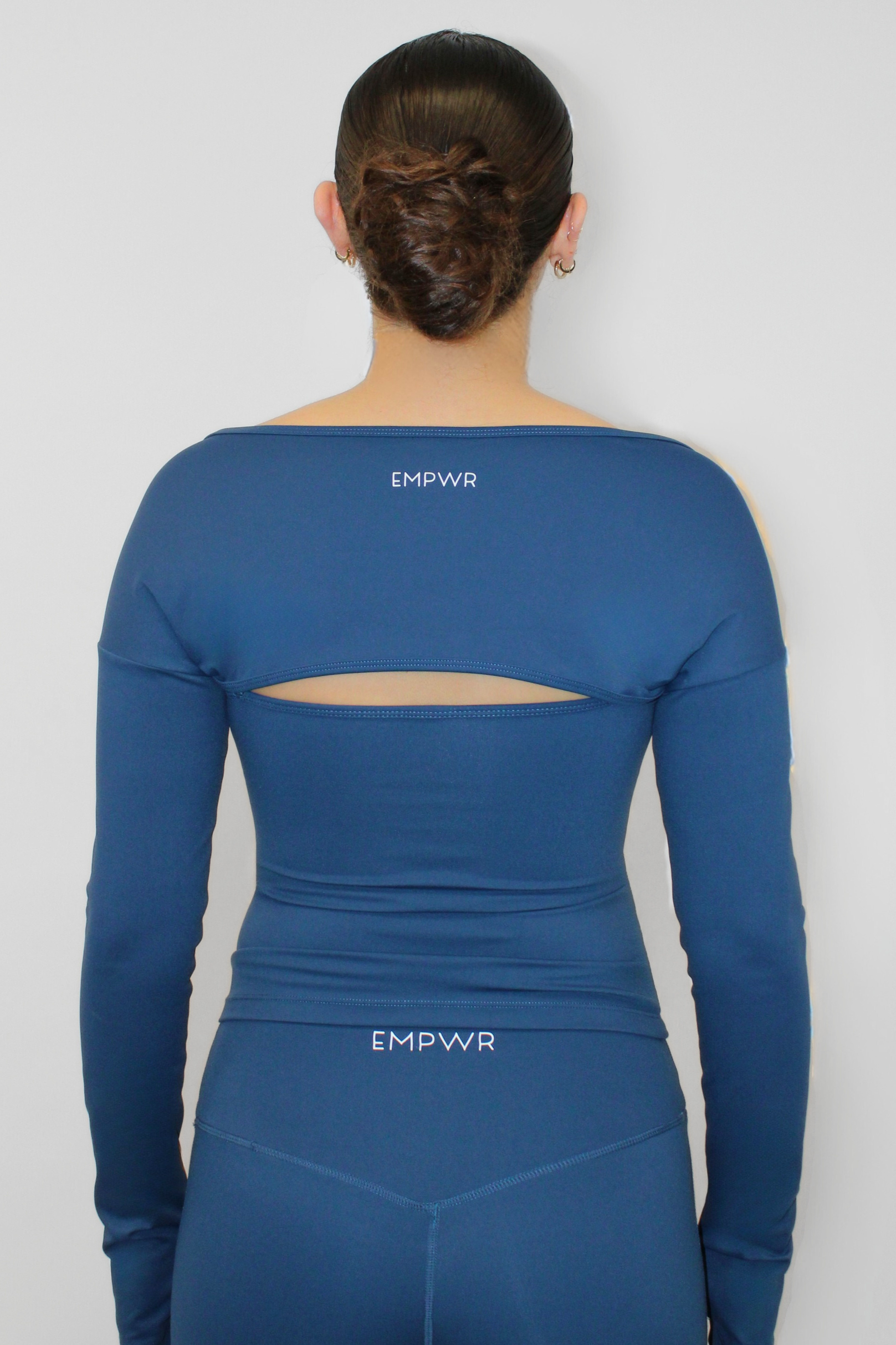 Covers the arms with form-fitting long sleeves and sits slightly over the shoulders.