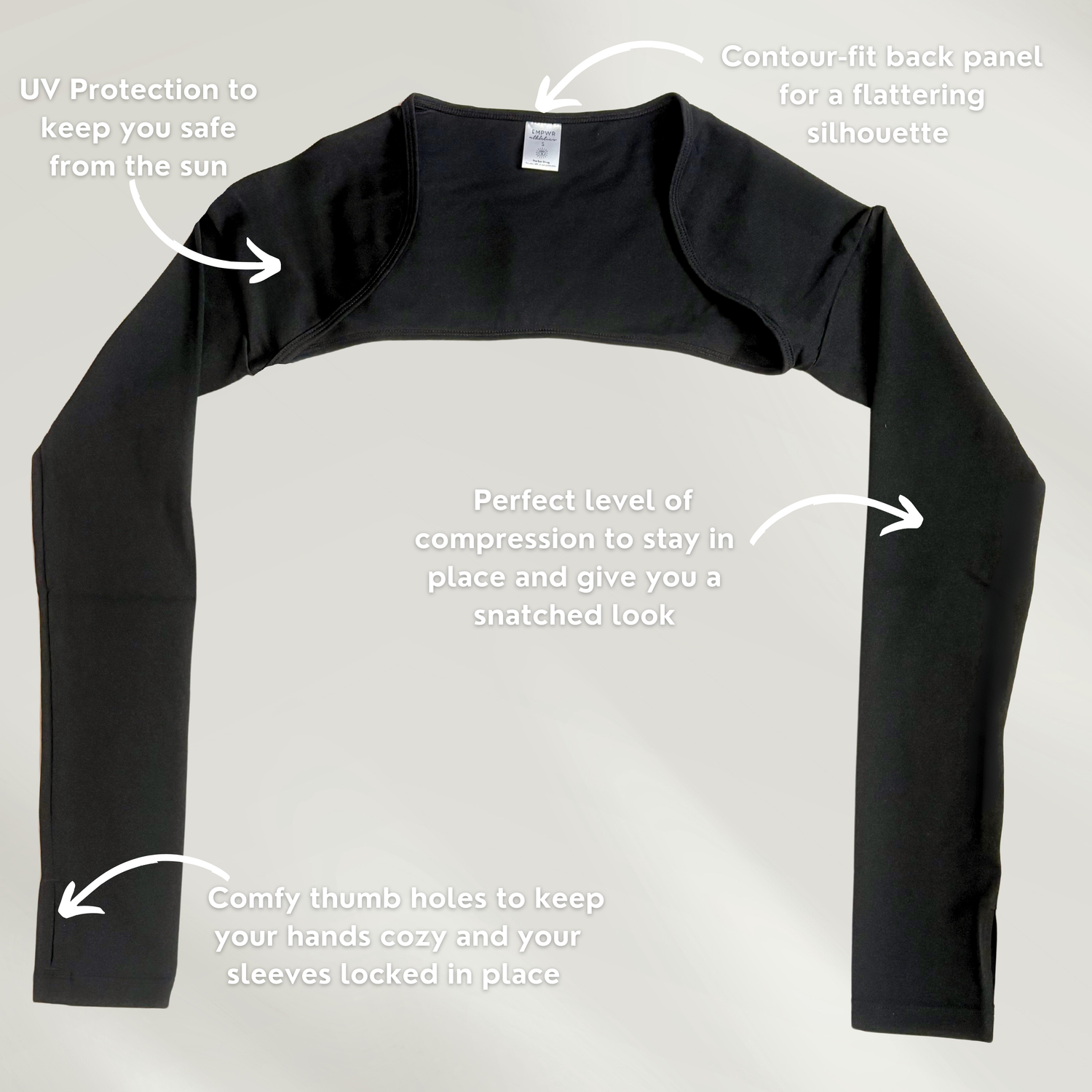Built-in UPF 50 protection that blocks 98% of harmful rays Compression-feel sleeves that sculpt your arms and stay in place through every move Made with a lightweight, breathable fabric that moves with you through everyday movement Keep your sleeves locked down and your hands cozy, whether you’re lifting or lounging Easy to take on and off, this open-front shrug adds style and protection without the heat of a full jacket The perfect silhouette that transitions from your heaviest set to your weekend coffee run☀️ Sun Safety