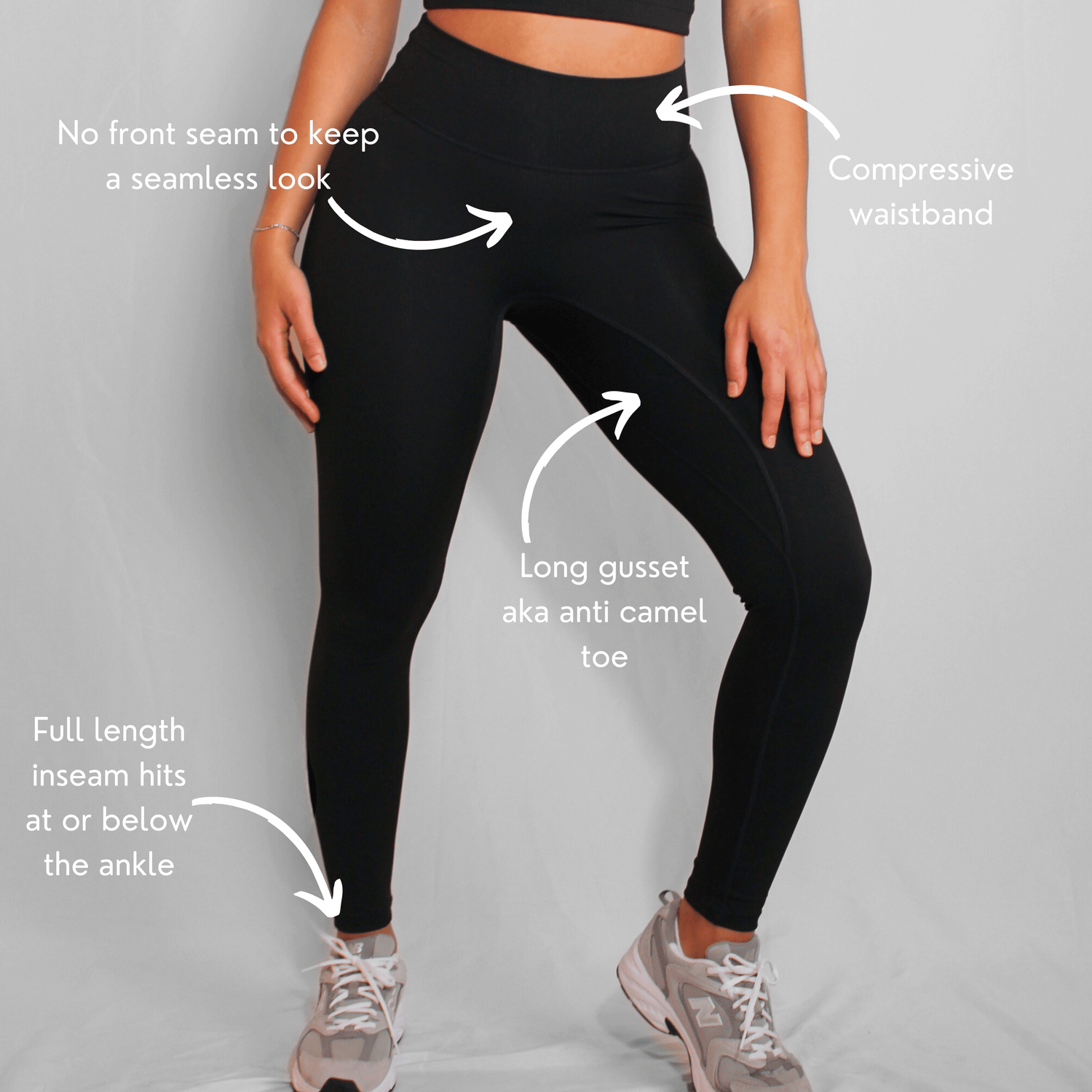 - Seamless front rise and long gusset stitching to prevent bunching (aka anti camel toe)